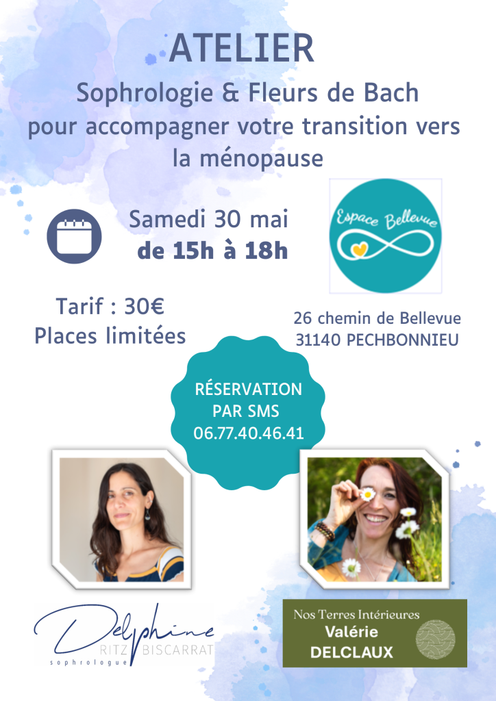 😄 Valérie DELCLAUX, conseillère agréée en Fleurs de Bach et moi-même animons un atelier samedi 30 mai 2026 : « Sophrologie et Fleurs de Bach pour accompagner votre transition vers la ménopause » à L’Espace Bellevue (Pechbonnieu).